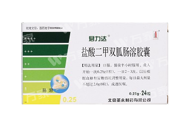 功能主治:(1) 本品首选用于单纯饮食控制及体育锻炼治疗无效的2型糖尿病,特别是肥胖的2型糖尿病。 (2) 对于1型或2型糖尿病,本品与胰岛素合用,可增加胰岛素的降血糖作用,减少胰岛素用量,防止低血糖发生。 (3) 本品也可与磺酰脲类等口服降血糖药合用,具协同作用。